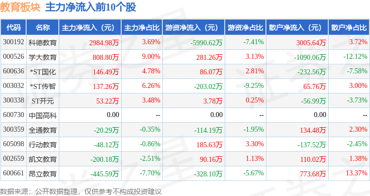 从资金流向上来看,当日教育板块主力资金净流出5518.9万元,游资资金净流出7128.52万元,散户资金净流入1.26亿元。教育板块个股资金流向见下表: