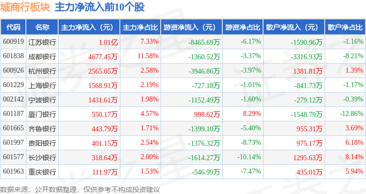 从资金流向上来看,当日城商行板块主力资金净流入1.18亿元,游资资金净流出2.15亿元,散户资金净流入9730.6万元。城商行板块个股资金流向见下表: