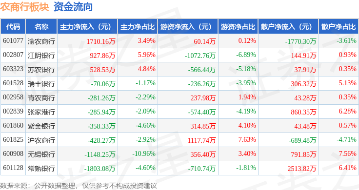 从资金流向上来看,当日农商行板块主力资金净流出1208.63万元,游资资金净流出1073.5万元,散户资金净流入2282.13万元。农商行板块个股资金流向见下表: