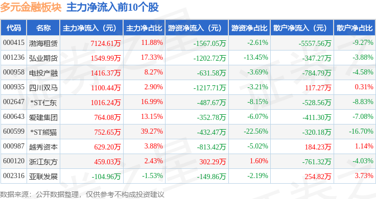 从资金流向上来看,当日多元金融板块主力资金净流出2.11亿元,游资资金净流出5133.42万元,散户资金净流入2.62亿元。多元金融板块个股资金流向见下表: