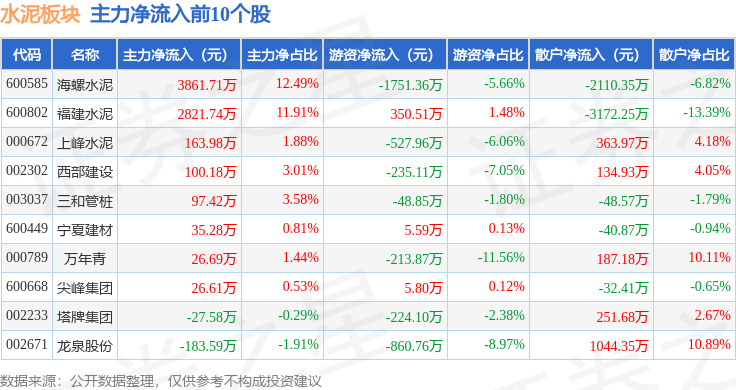 从资金流向上来看,当日水泥板块主力资金净流出8075.01万元,游资资金净流出7718.88万元,散户资金净流入1.58亿元。水泥板块个股资金流向见下表:
