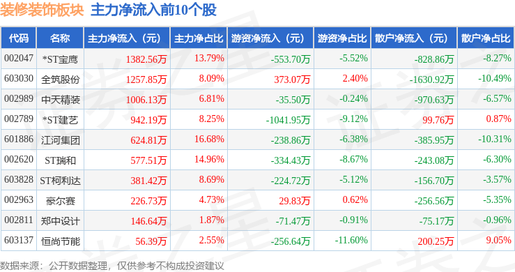 从资金流向上来看,当日装修装饰板块主力资金净流出1.19亿元,游资资金净流出455.3万元,散户资金净流入1.24亿元。装修装饰板块个股资金流向见下表: