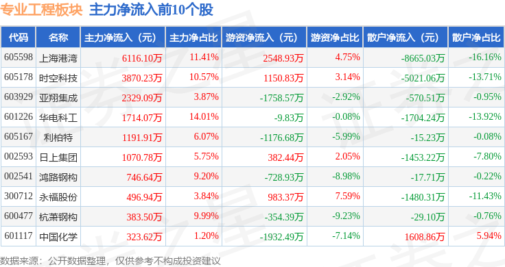 从资金流向上来看,当日专业工程板块主力资金净流出8659.85万元,游资资金净流入6208.71万元,散户资金净流入2451.15万元。专业工程板块个股资金流向见下表: