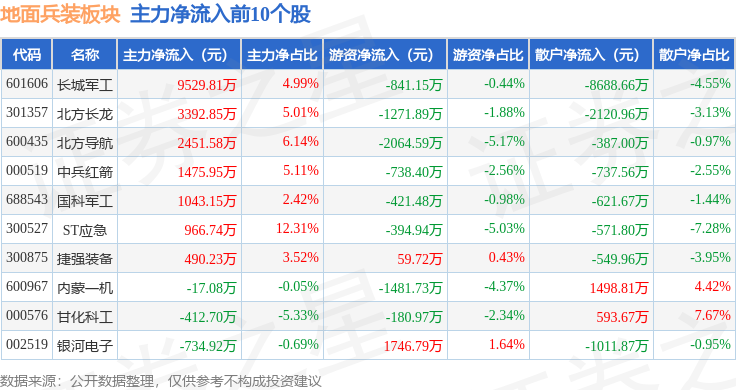 从资金流向上来看,当日地面兵装板块主力资金净流入1.21亿元,游资资金净流出3032.14万元,散户资金净流出9097.14万元。地面兵装板块个股资金流向见下表: