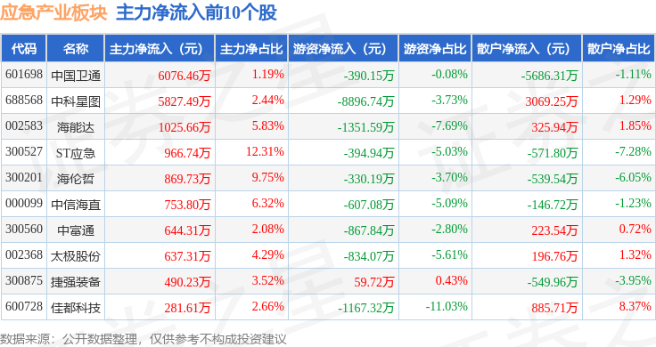 从资金流向上来看,当日应急产业板块主力资金净流出716.53万元,游资资金净流出2.36亿元,散户资金净流入2.44亿元。应急产业板块个股资金流向见下表: