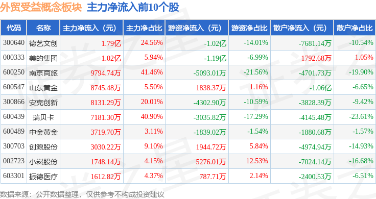 从资金流向上来看,当日外贸受益概念板块主力资金净流入1.14亿元,游资资金净流出6797.22万元,散户资金净流出4556.58万元。外贸受益概念板块个股资金流向见下表: