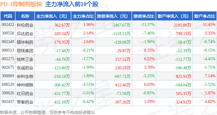 从资金流向上来看,当日PD-1抑制剂板块主力资金净流出1.93亿元,游资资金净流出1.24亿元,散户资金净流入3.17亿元。PD-1抑制剂板块个股资金流向见下表: