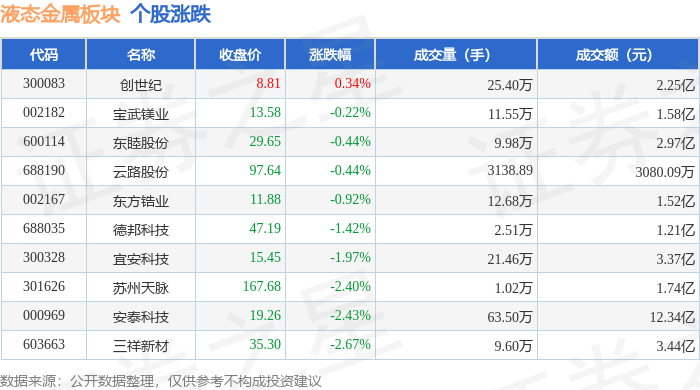 证券之星消息,12月18日液态金属板块较上一交易日下跌1.29%,三祥新材领跌。当日上证指数报收于3876.37,上涨0.16%。深证成指报收于13053.98,下跌1.29%。液态金属板块个股涨跌见下表: