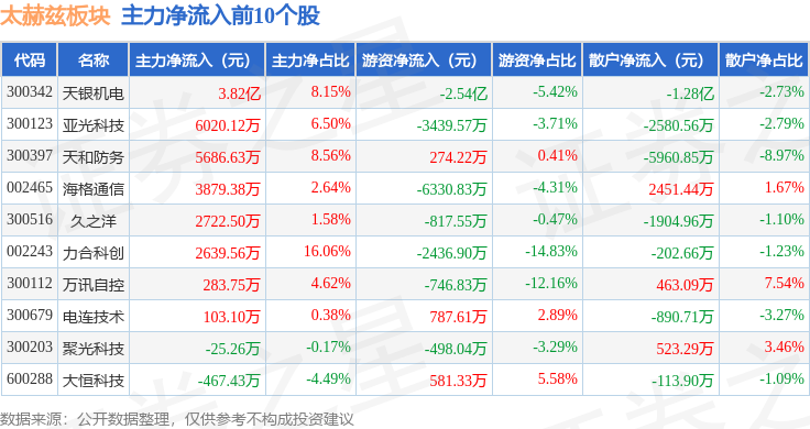 从资金流向上来看,当日太赫兹板块主力资金净流出6.44亿元,游资资金净流出3.84亿元,散户资金净流入10.28亿元。太赫兹板块个股资金流向见下表: