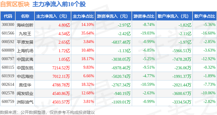从资金流向上来看,当日自贸区板块主力资金净流出14.57亿元,游资资金净流出6.25亿元,散户资金净流入20.82亿元。自贸区板块个股资金流向见下表: