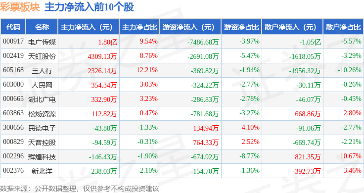 从资金流向上来看,当日彩票板块主力资金净流入8004.42万元,游资资金净流出1.08亿元,散户资金净流入2798.75万元。彩票板块个股资金流向见下表: