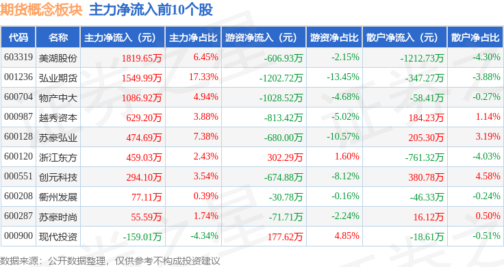 从资金流向上来看,当日期货概念板块主力资金净流出11.04亿元,游资资金净流入4.05亿元,散户资金净流入6.99亿元。期货概念板块个股资金流向见下表: