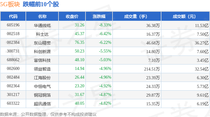 证券之星消息,12月18日5G板块较上一交易日下跌1.33%,华通线缆领跌。当日上证指数报收于3876.37,上涨0.16%。深证成指报收于13053.98,下跌1.29%。5G板块个股涨跌见下表:
