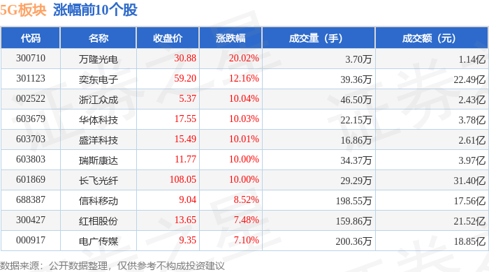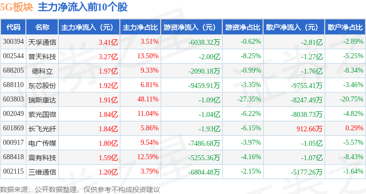 从资金流向上来看,当日5G板块主力资金净流出64.02亿元,游资资金净流入11.32亿元,散户资金净流入52.7亿元。5G板块个股资金流向见下表: