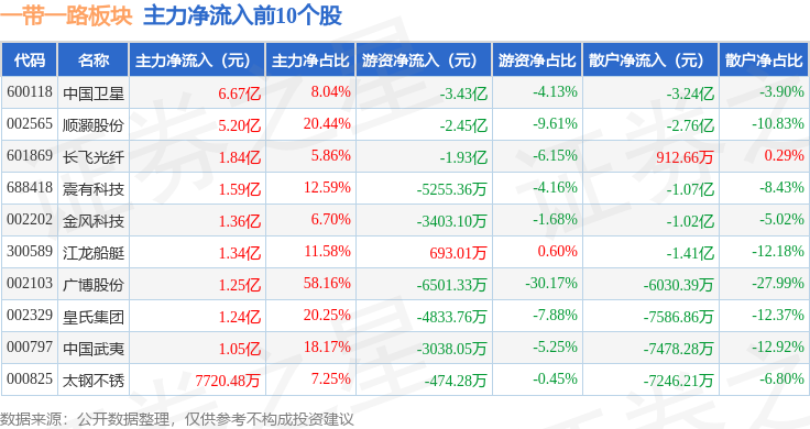 从资金流向上来看,当日一带一路板块主力资金净流出47.01亿元,游资资金净流出5.46亿元,散户资金净流入52.47亿元。一带一路板块个股资金流向见下表: