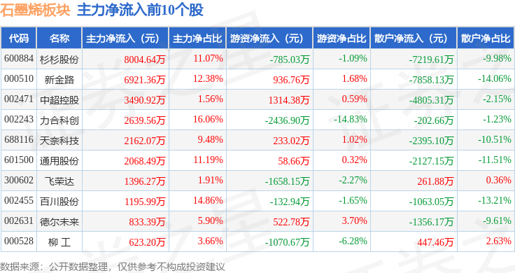 从资金流向上来看,当日石墨烯板块主力资金净流出10.22亿元,游资资金净流入2009.07万元,散户资金净流入10.02亿元。石墨烯板块个股资金流向见下表: