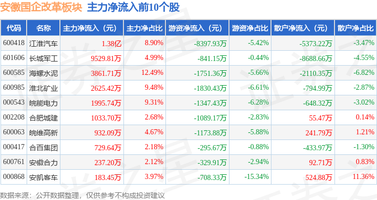 从资金流向上来看,当日安徽国企改革板块主力资金净流出2.8亿元,游资资金净流入865.28万元,散户资金净流入2.71亿元。安徽国企改革板块个股资金流向见下表: