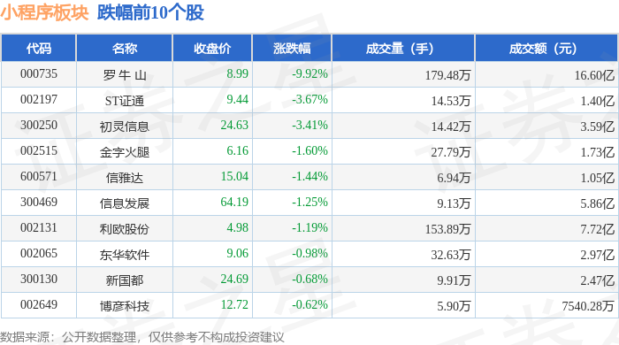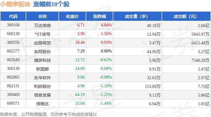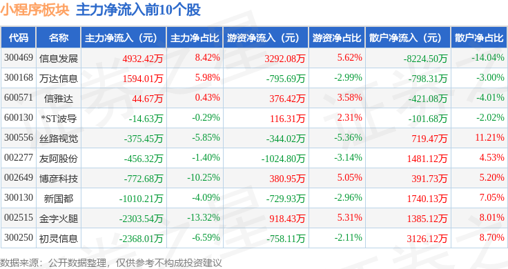 从资金流向上来看,当日小程序板块主力资金净流出3.25亿元,游资资金净流入6371.4万元,散户资金净流入2.61亿元。小程序板块个股资金流向见下表: