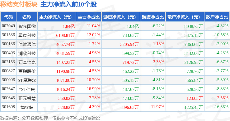 从资金流向上来看,当日移动支付板块主力资金净流出14.58亿元,游资资金净流入3.83亿元,散户资金净流入10.75亿元。移动支付板块个股资金流向见下表: