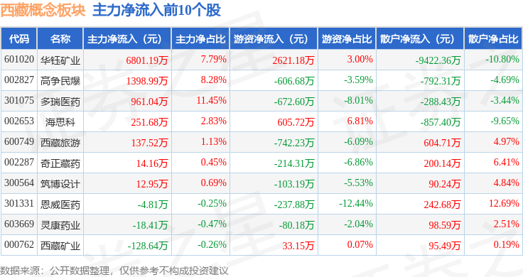 从资金流向上来看,当日西藏概念板块主力资金净流出9979.77万元,游资资金净流出135.68万元,散户资金净流入1.01亿元。西藏概念板块个股资金流向见下表: