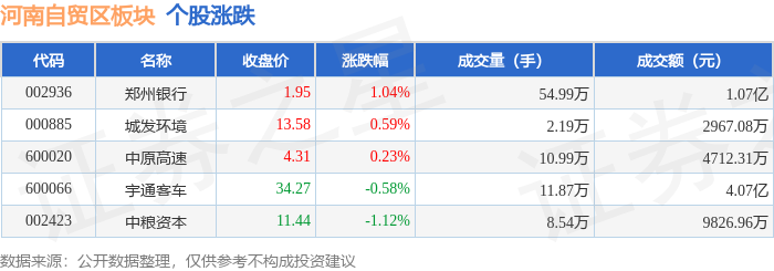 证券之星消息,12月18日河南自贸区板块较上一交易日下跌0.39%,中粮资本领跌。当日上证指数报收于3876.37,上涨0.16%。深证成指报收于13053.98,下跌1.29%。河南自贸区板块个股涨跌见下表: