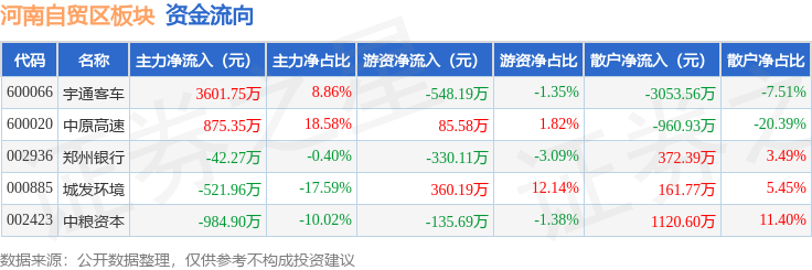 从资金流向上来看,当日河南自贸区板块主力资金净流入2927.95万元,游资资金净流出568.22万元,散户资金净流出2359.73万元。河南自贸区板块个股资金流向见下表:
