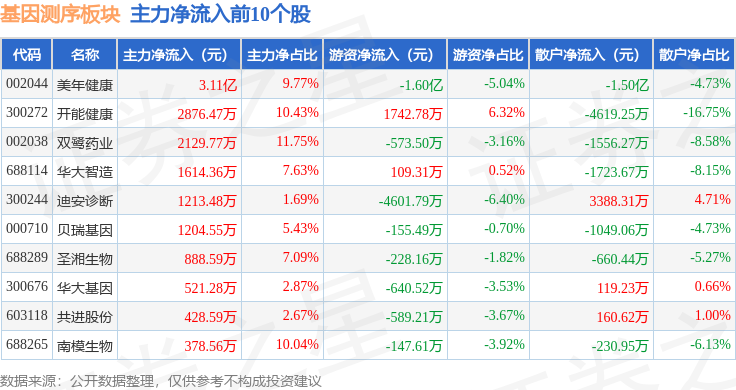 从资金流向上来看,当日基因测序板块主力资金净流入1.77亿元,游资资金净流出2.12亿元,散户资金净流入3456.98万元。基因测序板块个股资金流向见下表: