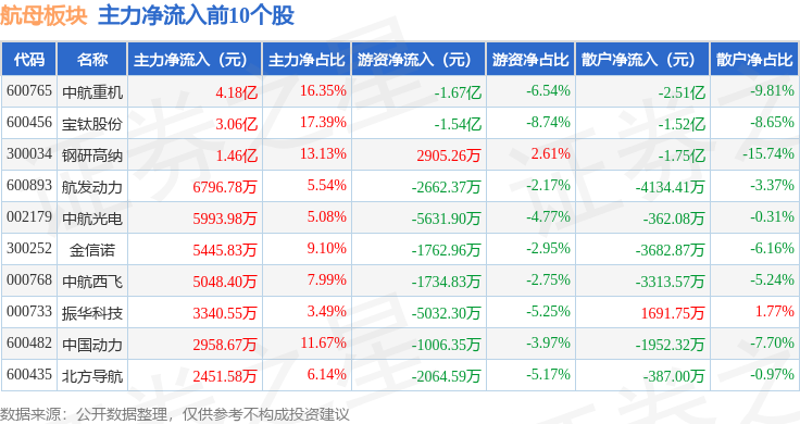 从资金流向上来看,当日航母板块主力资金净流入8.53亿元,游资资金净流出3.77亿元,散户资金净流出4.76亿元。航母板块个股资金流向见下表:
