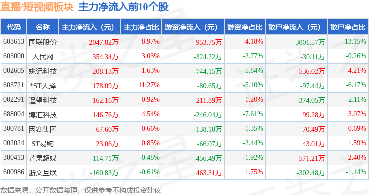 从资金流向上来看,当日直播/短视频板块主力资金净流出4.34亿元,游资资金净流入7333.7万元,散户资金净流入3.61亿元。直播/短视频板块个股资金流向见下表: