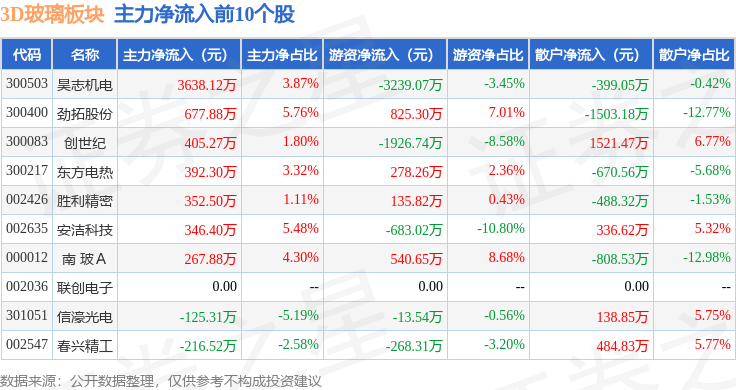从资金流向上来看,当日3D玻璃板块主力资金净流出8.97亿元,游资资金净流入2.02亿元,散户资金净流入6.95亿元。3D玻璃板块个股资金流向见下表: