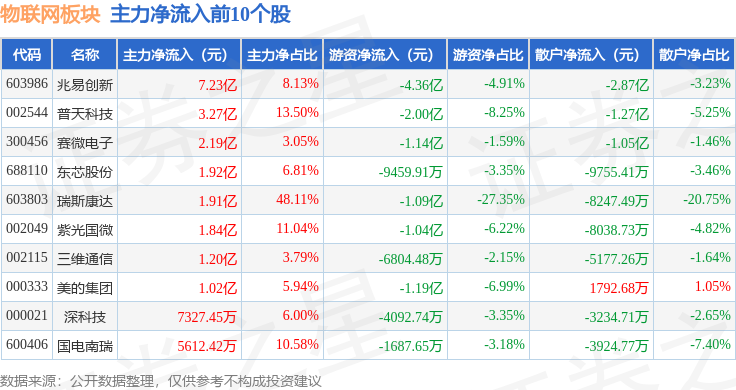 从资金流向上来看,当日物联网板块主力资金净流出46.36亿元,游资资金净流出1.43亿元,散户资金净流入47.79亿元。物联网板块个股资金流向见下表: