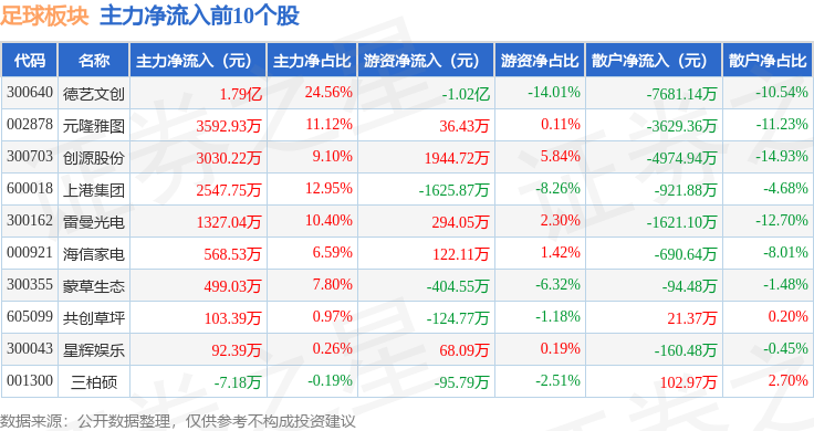 从资金流向上来看,当日足球板块主力资金净流入1.64亿元,游资资金净流出1.1亿元,散户资金净流出5389.32万元。足球板块个股资金流向见下表: