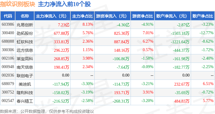从资金流向上来看,当日指纹识别板块主力资金净流出3.56亿元,游资资金净流出1.02亿元,散户资金净流入4.57亿元。指纹识别板块个股资金流向见下表: