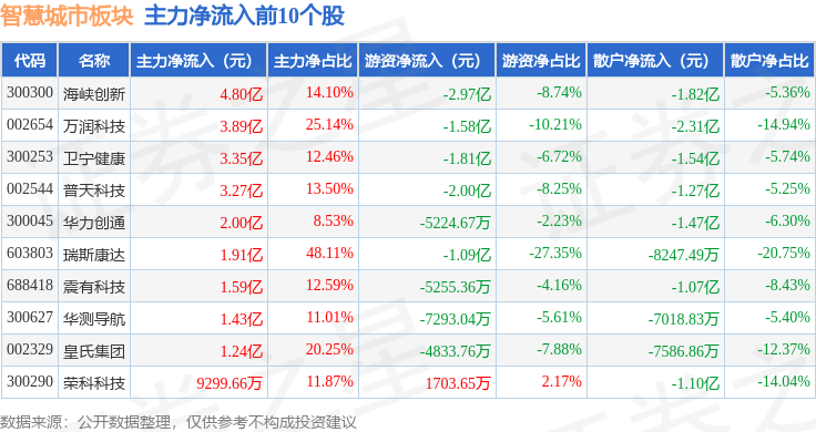 从资金流向上来看,当日智慧城市板块主力资金净流出37.84亿元,游资资金净流出8.67亿元,散户资金净流入46.51亿元。智慧城市板块个股资金流向见下表: