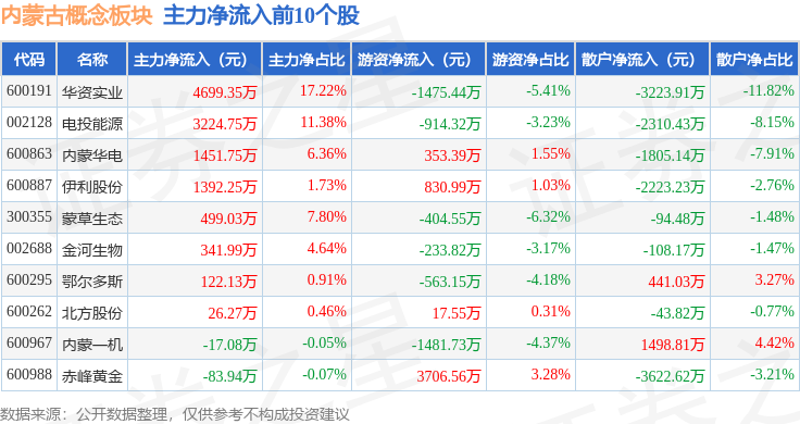 从资金流向上来看,当日内蒙古概念板块主力资金净流出5.53亿元,游资资金净流入1.78亿元,散户资金净流入3.75亿元。内蒙古概念板块个股资金流向见下表: