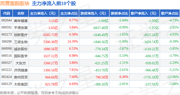 从资金流向上来看,当日民营医院板块主力资金净流入4.15亿元,游资资金净流出2.44亿元,散户资金净流出1.71亿元。民营医院板块个股资金流向见下表: