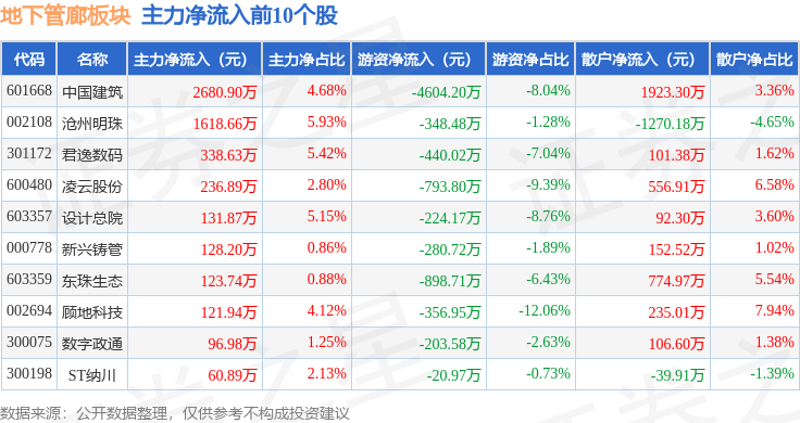 从资金流向上来看,当日地下管廊板块主力资金净流出3.26亿元,游资资金净流入2718.9万元,散户资金净流入2.99亿元。地下管廊板块个股资金流向见下表: