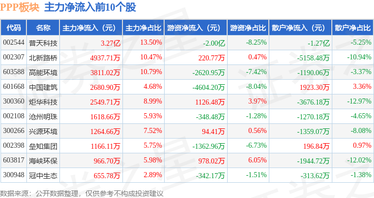 从资金流向上来看,当日PPP板块主力资金净流出6.04亿元,游资资金净流出1.96亿元,散户资金净流入7.99亿元。PPP板块个股资金流向见下表: