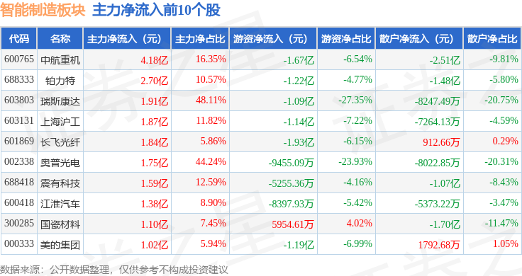 从资金流向上来看,当日智能制造板块主力资金净流出78.86亿元,游资资金净流入3.19亿元,散户资金净流入75.66亿元。智能制造板块个股资金流向见下表: