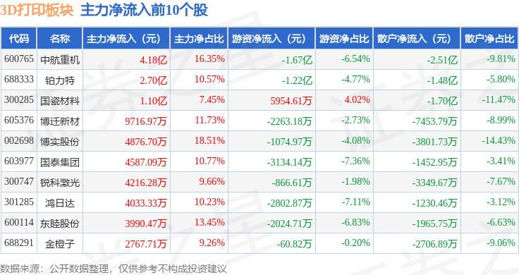 从资金流向上来看,当日3D打印板块主力资金净流入1.85亿元,游资资金净流出4.51亿元,散户资金净流入2.66亿元。3D打印板块个股资金流向见下表: