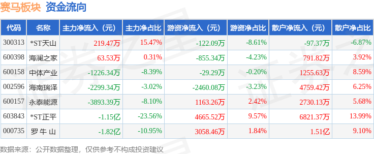 从资金流向上来看,当日赛马板块主力资金净流出3.68亿元,游资资金净流入5420.44万元,散户资金净流入3.14亿元。赛马板块个股资金流向见下表: