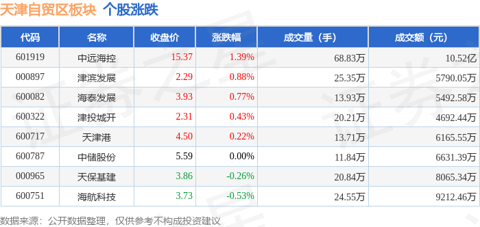 证券之星消息,12月18日天津自贸区板块较上一交易日上涨1.12%,中远海控领涨。当日上证指数报收于3876.37,上涨0.16%。深证成指报收于13053.98,下跌1.29%。天津自贸区板块个股涨跌见下表: