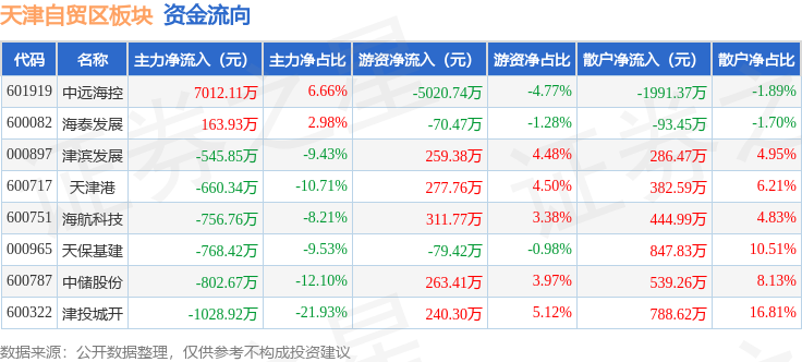 从资金流向上来看,当日天津自贸区板块主力资金净流入2613.08万元,游资资金净流出3818.02万元,散户资金净流入1204.93万元。天津自贸区板块个股资金流向见下表: