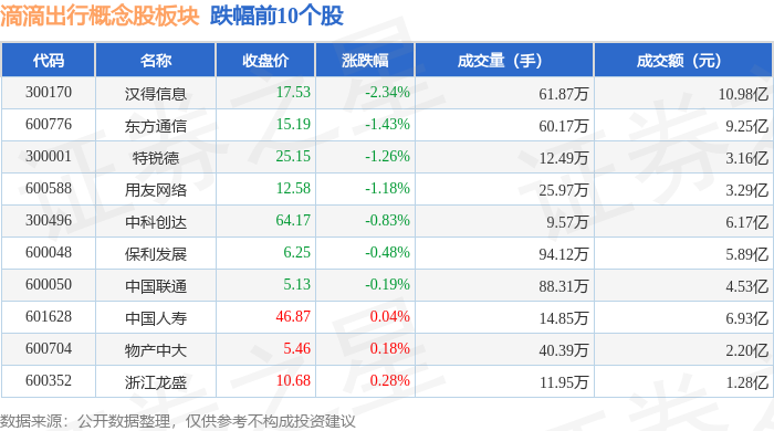 证券之星消息,12月18日滴滴出行概念股板块较上一交易日下跌0.08%,汉得信息领跌。当日上证指数报收于3876.37,上涨0.16%。深证成指报收于13053.98,下跌1.29%。滴滴出行概念股板块个股涨跌见下表: