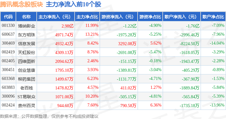 从资金流向上来看,当日腾讯概念股板块主力资金净流出27.73亿元,游资资金净流入5.2亿元,散户资金净流入22.54亿元。腾讯概念股板块个股资金流向见下表: