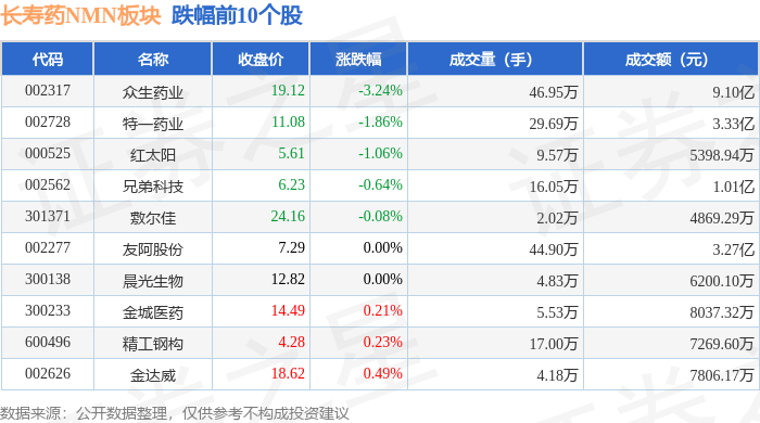 证券之星消息,12月18日长寿药NMN板块较上一交易日上涨0.37%,双鹭药业领涨。当日上证指数报收于3876.37,上涨0.16%。深证成指报收于13053.98,下跌1.29%。长寿药NMN板块个股涨跌见下表: