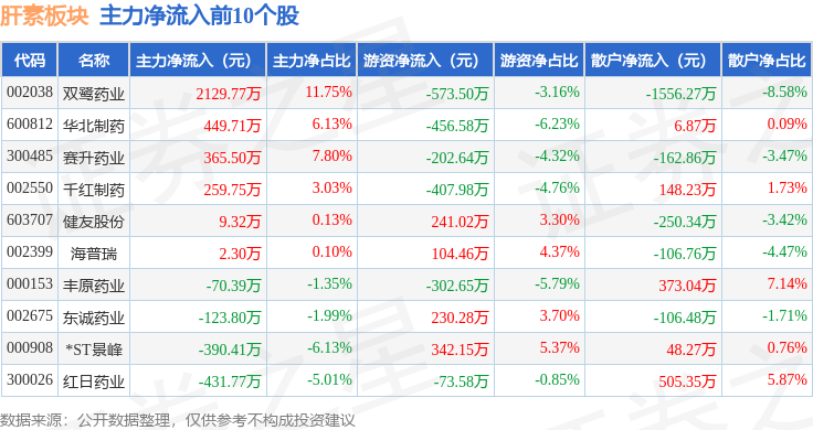 从资金流向上来看,当日肝素板块主力资金净流出8396.92万元,游资资金净流入3678.27万元,散户资金净流入4718.65万元。肝素板块个股资金流向见下表:
