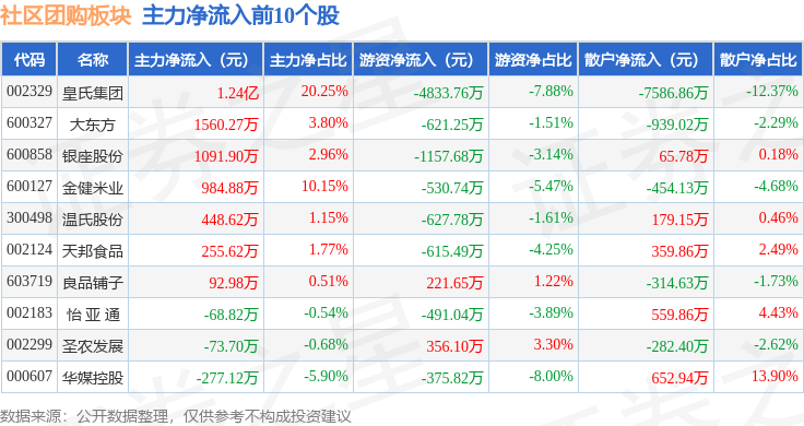从资金流向上来看,当日社区团购板块主力资金净流出6.62亿元,游资资金净流入5614.4万元,散户资金净流入6.06亿元。社区团购板块个股资金流向见下表: