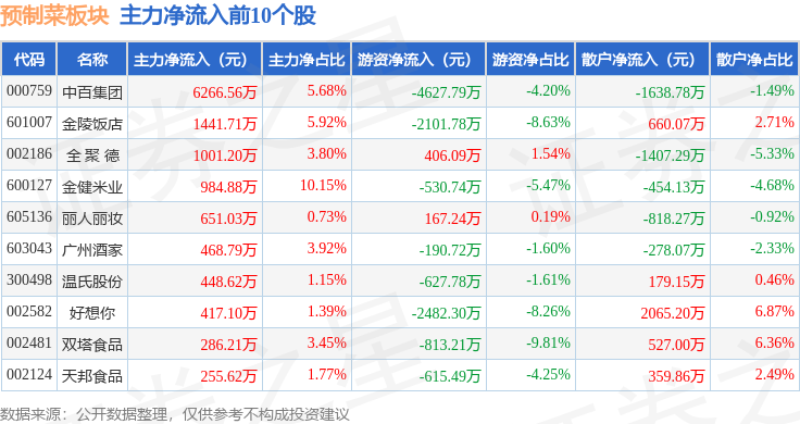 从资金流向上来看,当日预制菜板块主力资金净流出5.79亿元,游资资金净流出9420.26万元,散户资金净流入6.73亿元。预制菜板块个股资金流向见下表: