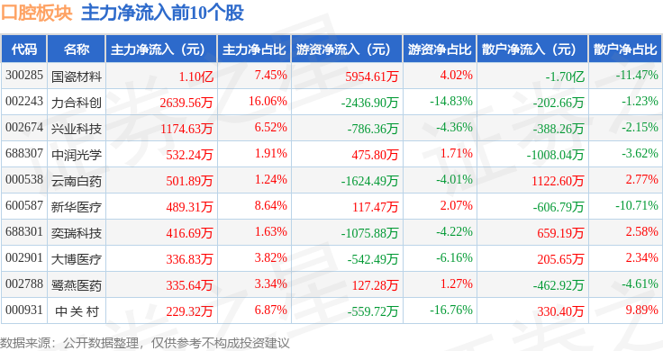 从资金流向上来看,当日口腔板块主力资金净流出2.5亿元,游资资金净流出1.28亿元,散户资金净流入3.78亿元。口腔板块个股资金流向见下表: